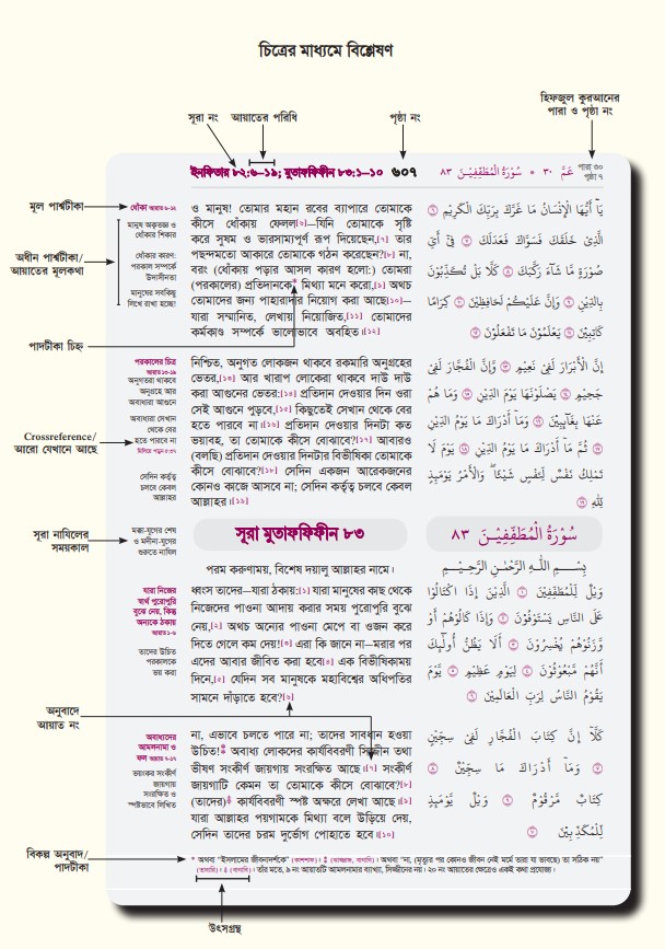 • আয়াতের শিক্ষা ও প্রাসঙ্গিক বিষয়গুলো অনুবাদের পাশেই উল্লেখ করার কারণে কুরআন অনুধাবন করা অনেক বেশি প্রাণবন্ত হয়ে উঠবে। এ ছাড়া পার্শ্বটীকায় আরও দেওয়া হয়েছে ওই সূরার মেজর থিম বা মূল আলোচ্য বিষয়গুলো, যা এক-নজরে পড়ে নিলে সূরার ব্যাপারে সার্বিক ধারণা পাওয়া যাবে, সহজে খুঁজে পাওয়ার জন্য মূল পার্শ্বটীকাগুলোকে রঙিন কালিতে উপস্থাপন করা হয়েছে।